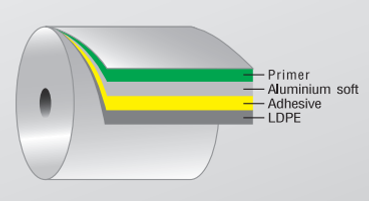 Soft Aluminium Foil, thickness 30-45 microns. One side Prime coated for printing, the other side laminated with PE for sealing itself.